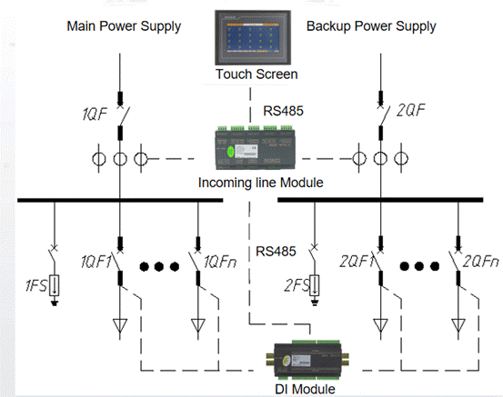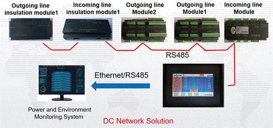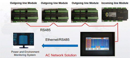 Data centralized monitoring and display by HMI and data is uploaded to power and environment monitoring system through RS485.